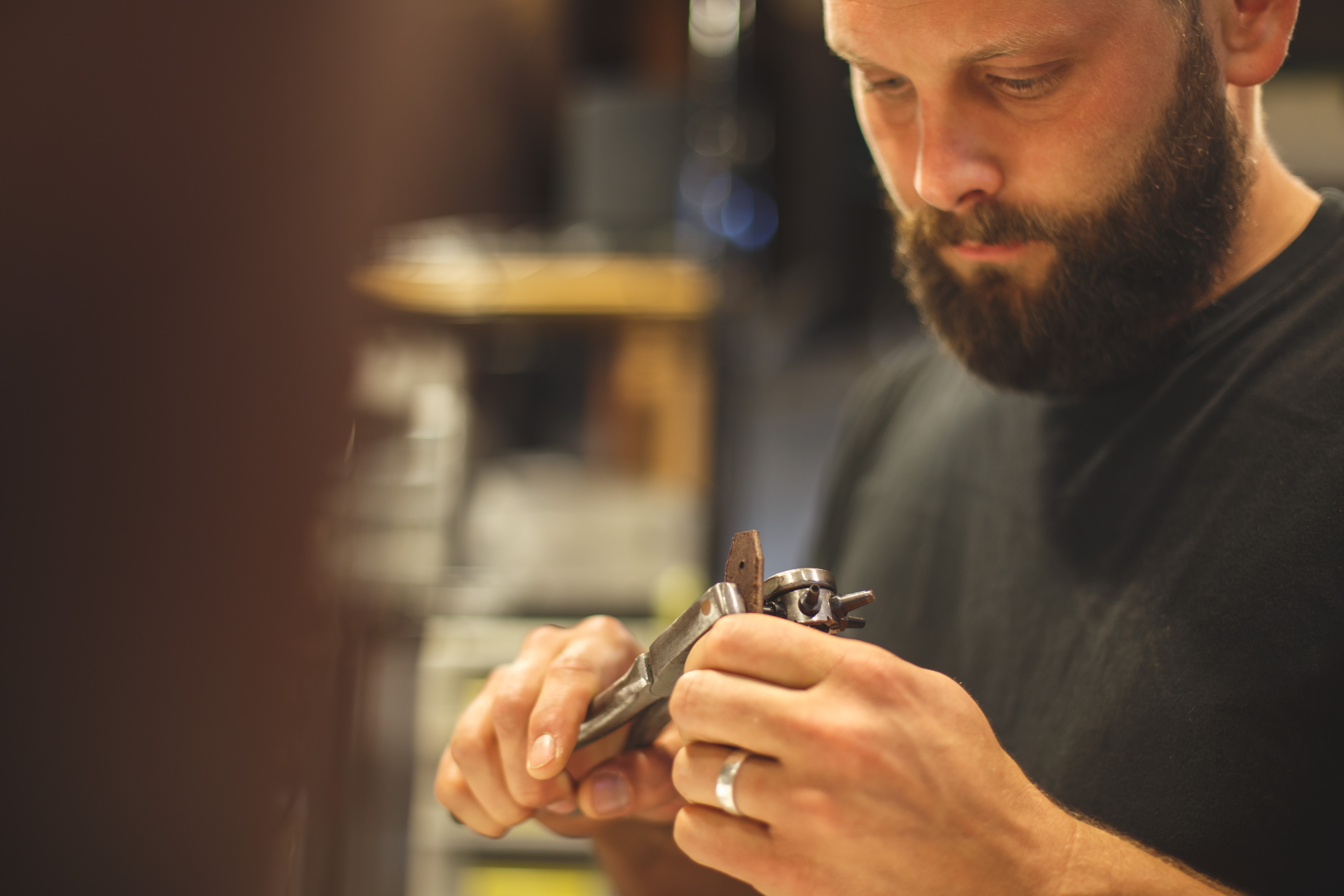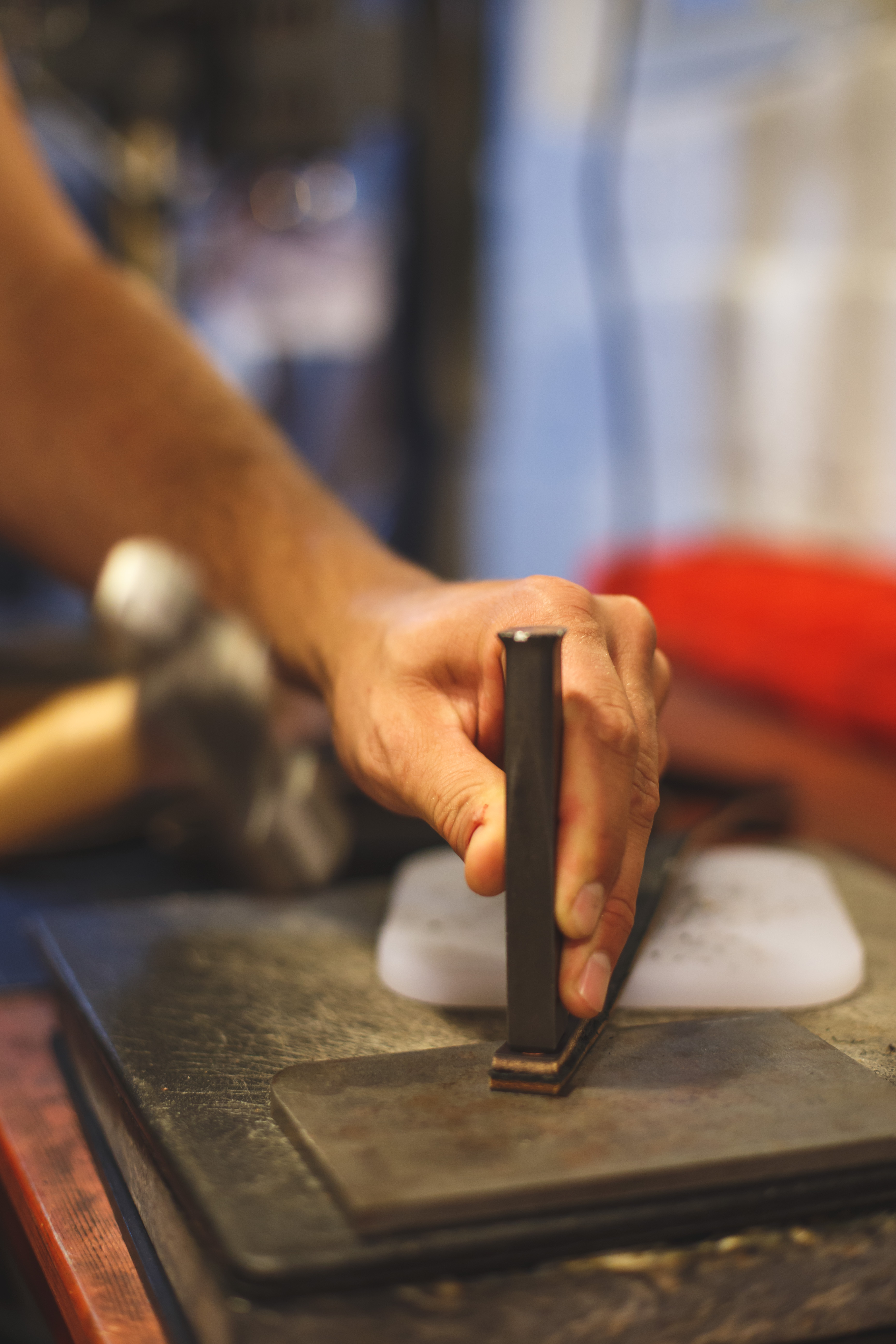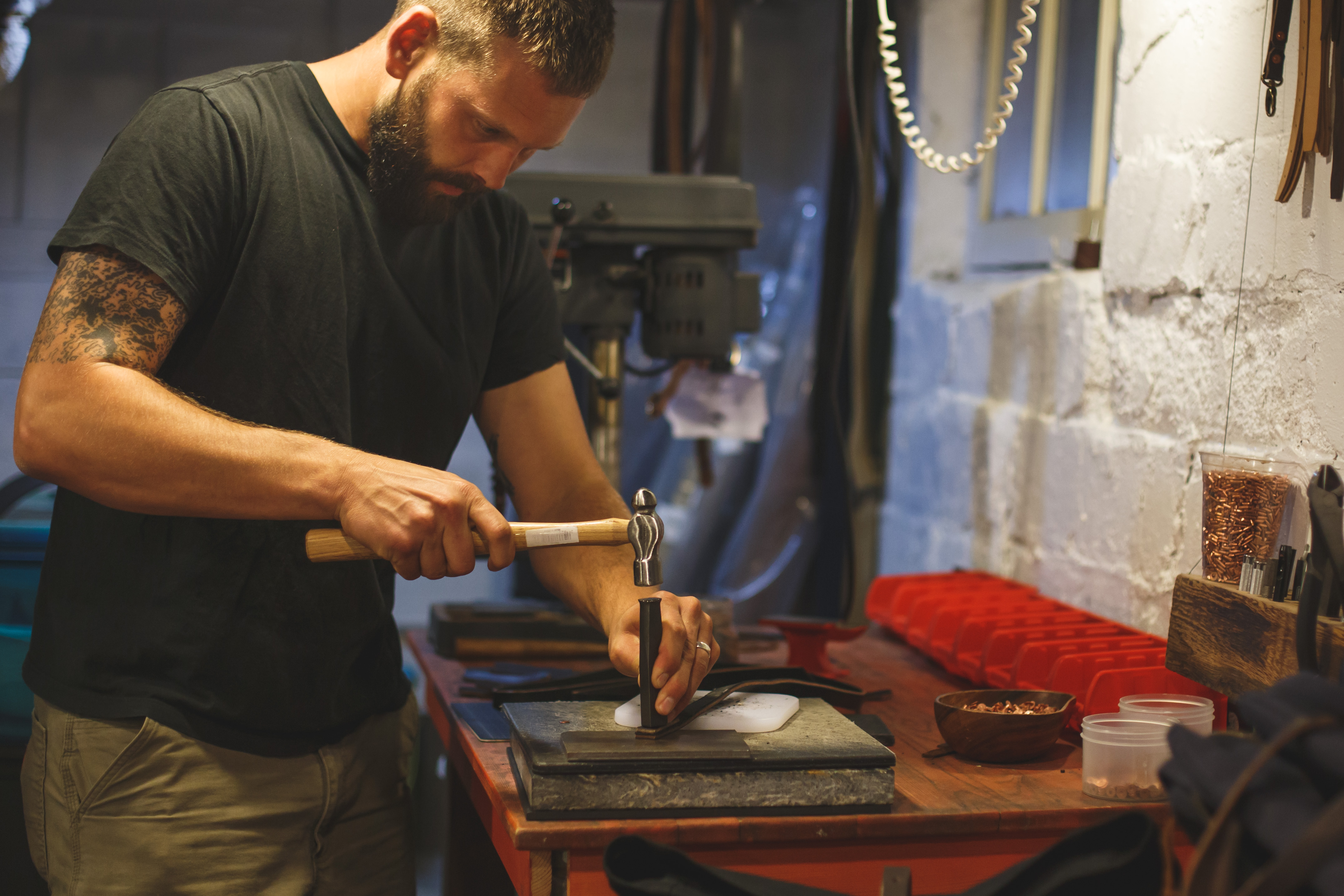 Luke embraces the intentional, steady, and precise nature of his work, and his workshop reflects this approach to craftsmanship. Even the bits of copper waste from the riveting work have an assigned place. The space is unadorned save for the tools, patterns, and materials he needs to create his high-quality leather bags.