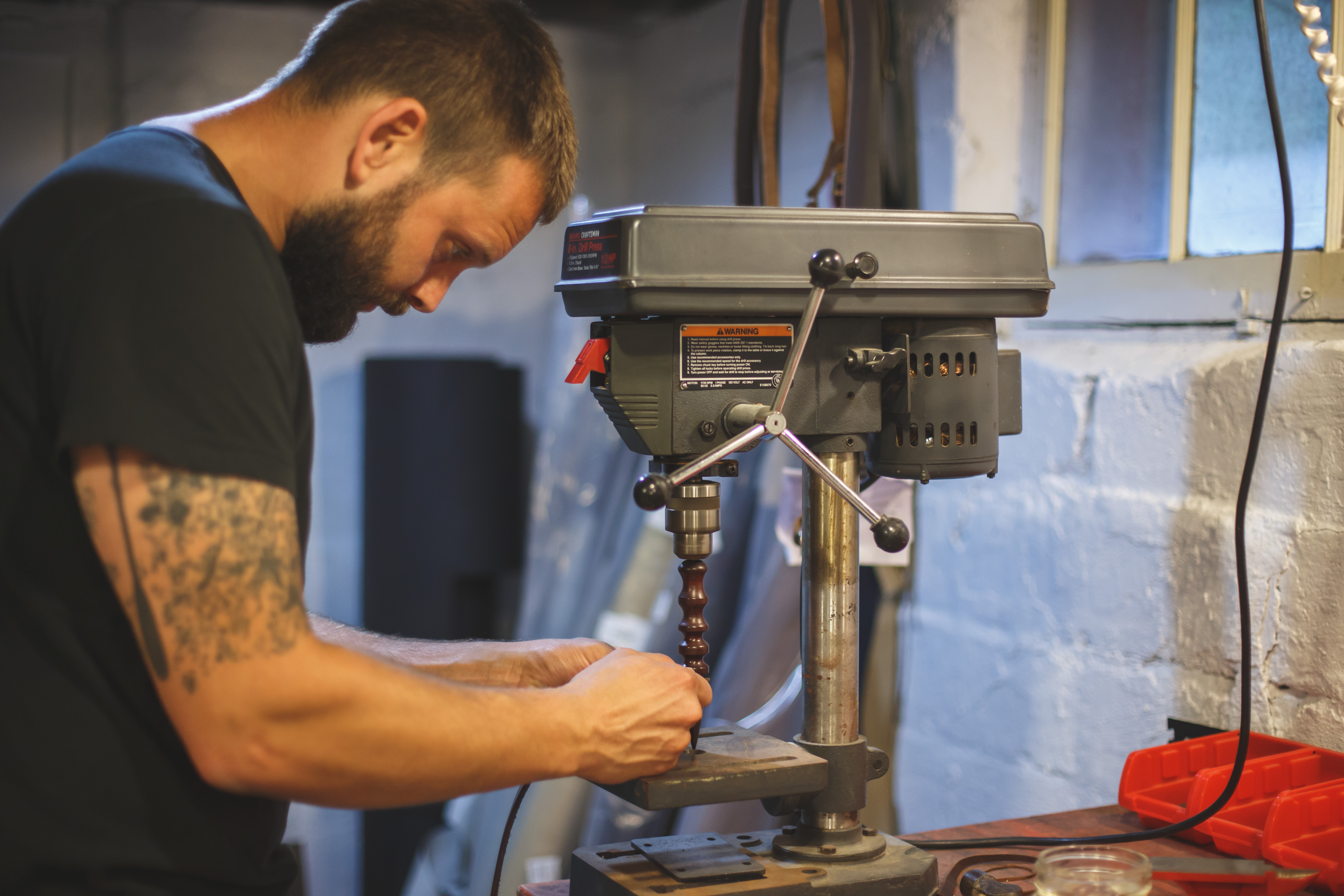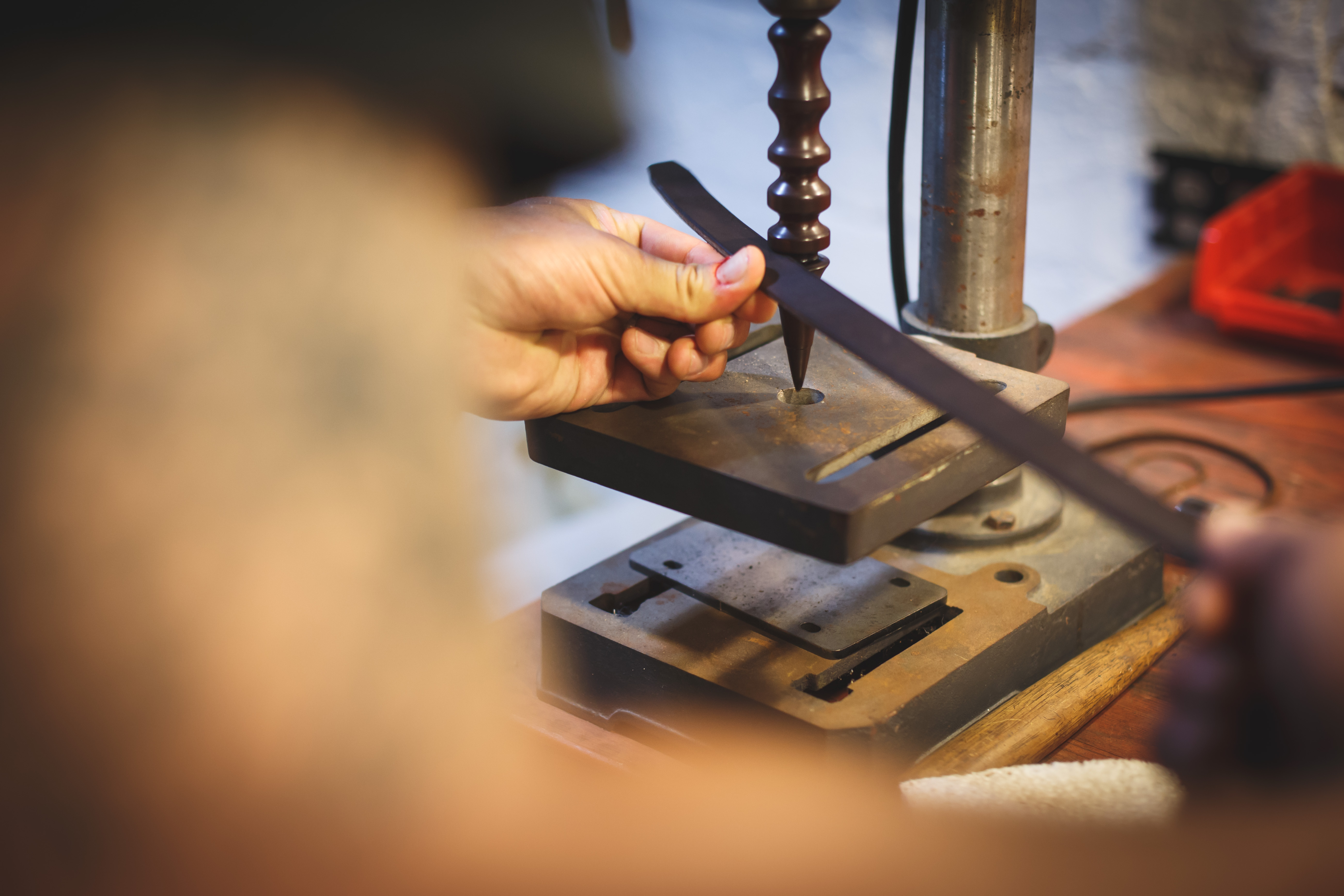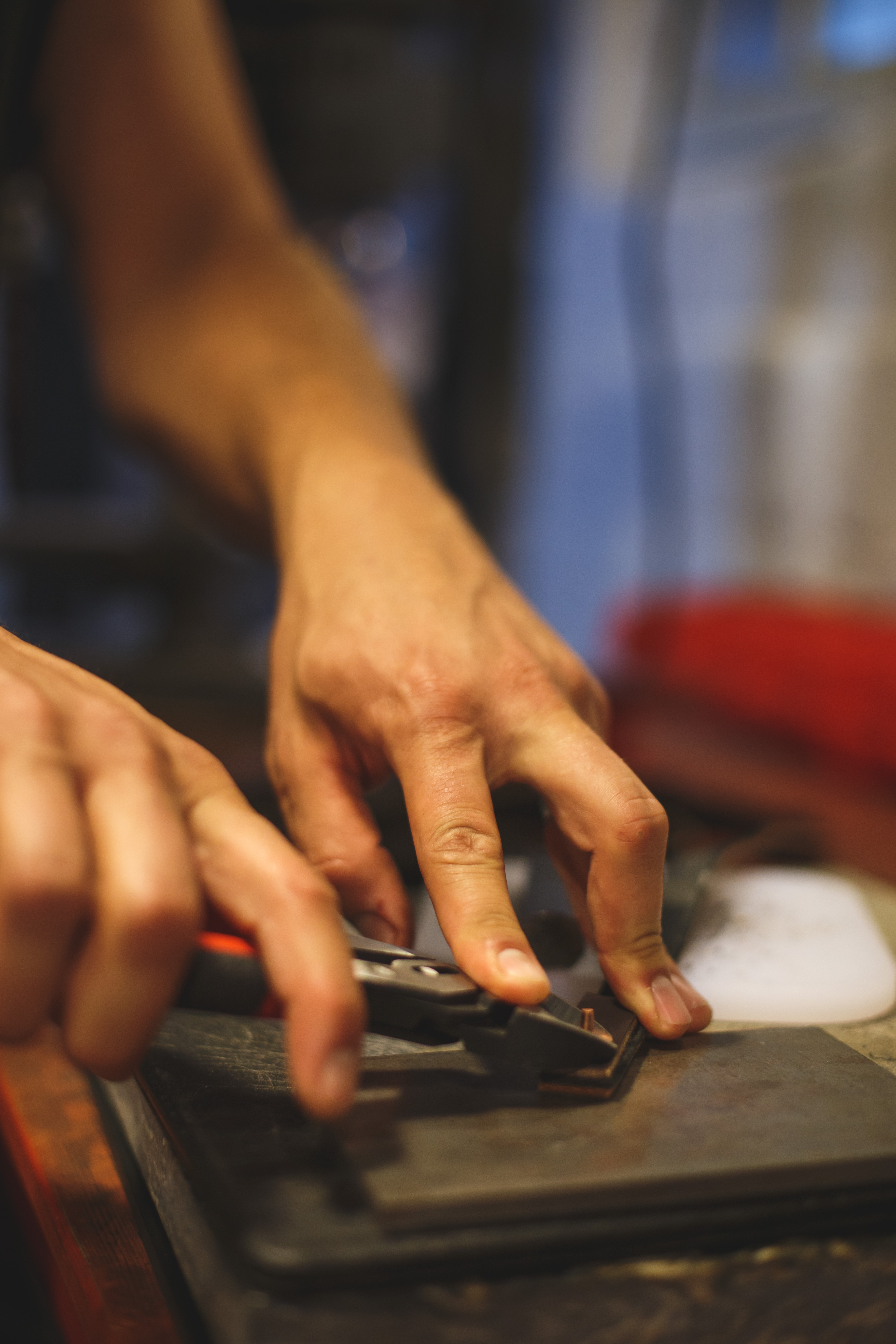 Luke embraces the intentional, steady, and precise nature of his work, and his workshop reflects this approach to craftsmanship. Even the bits of copper waste from the riveting work have an assigned place. The space is unadorned save for the tools, patterns, and materials he needs to create his high-quality leather bags.