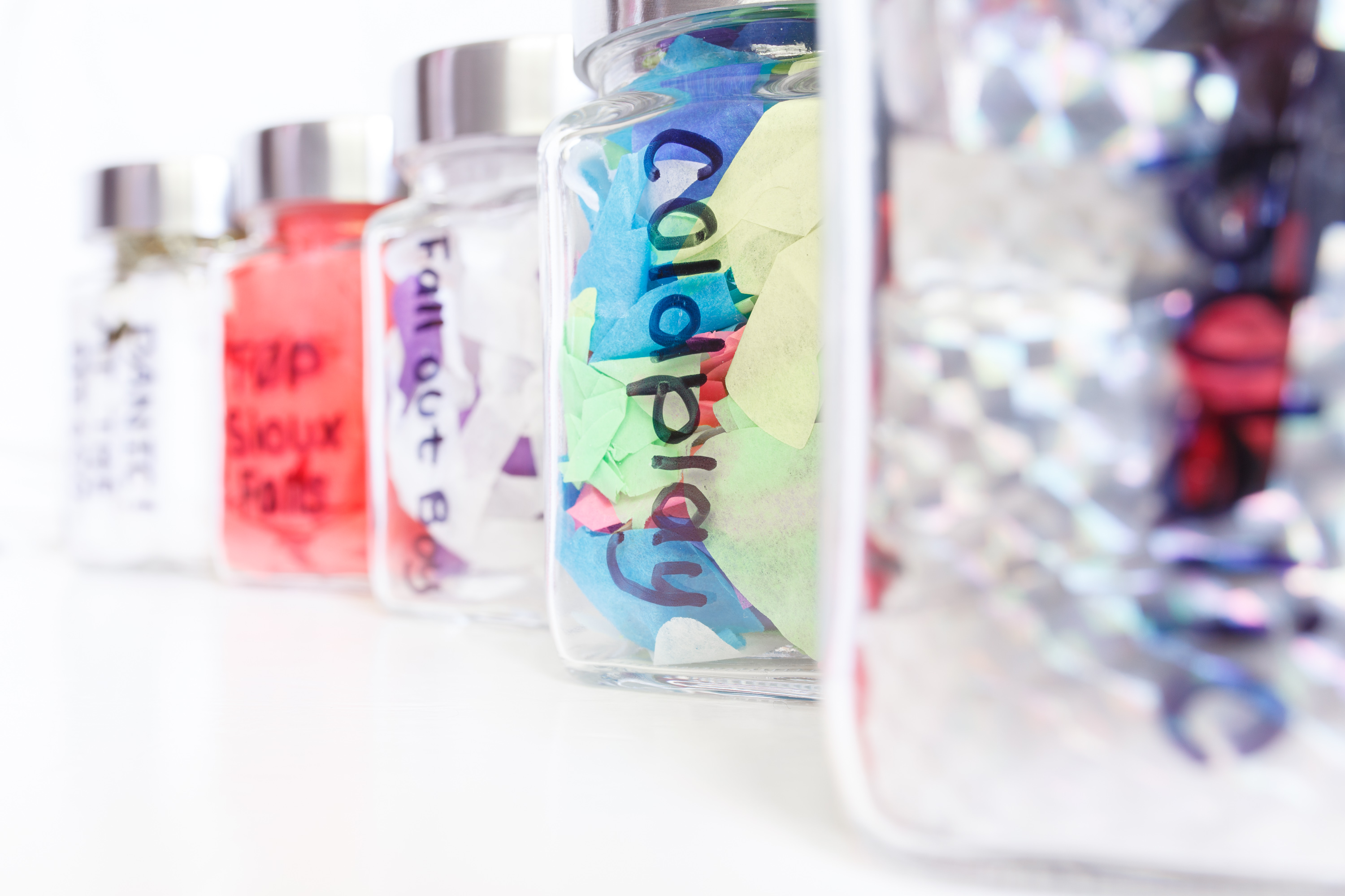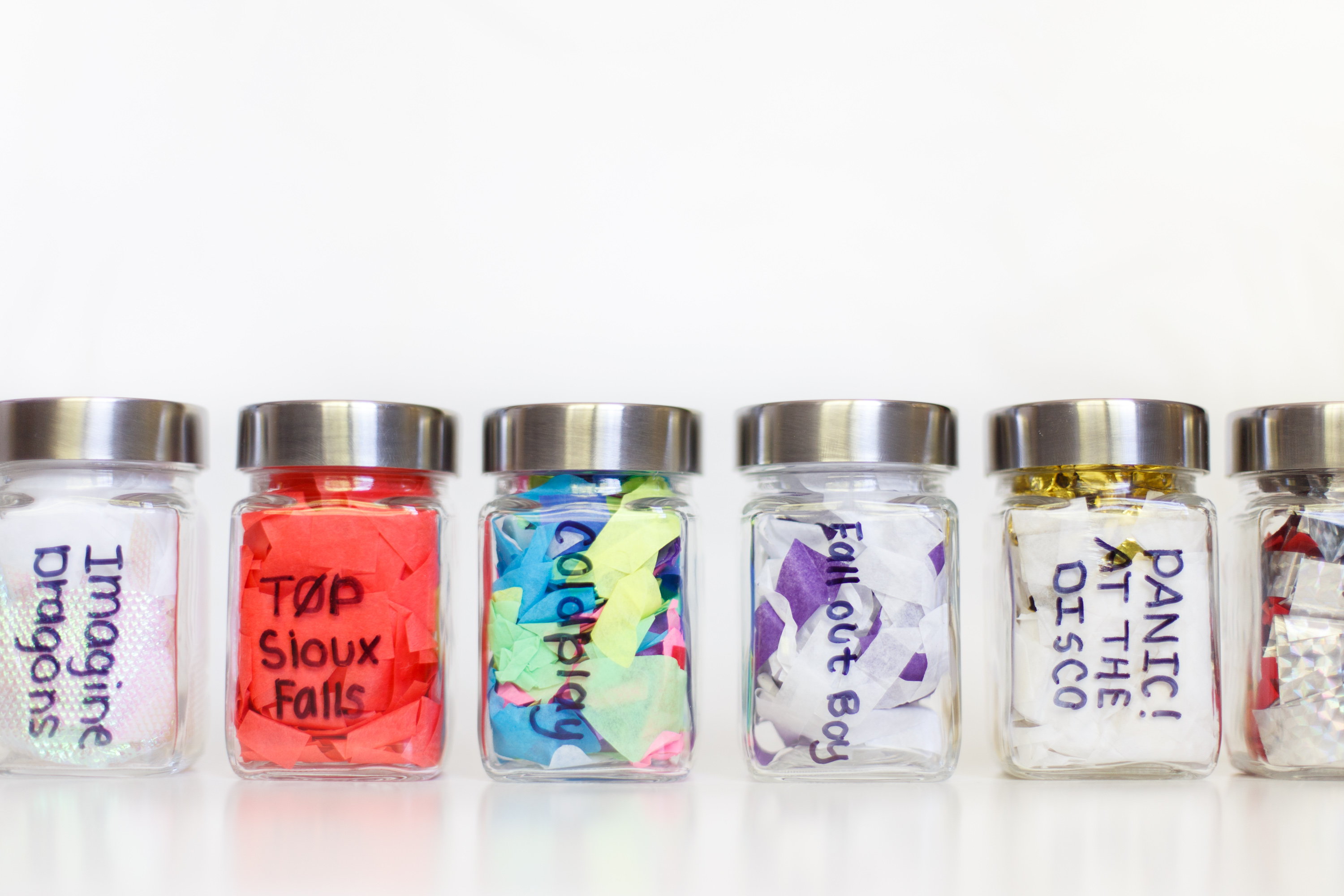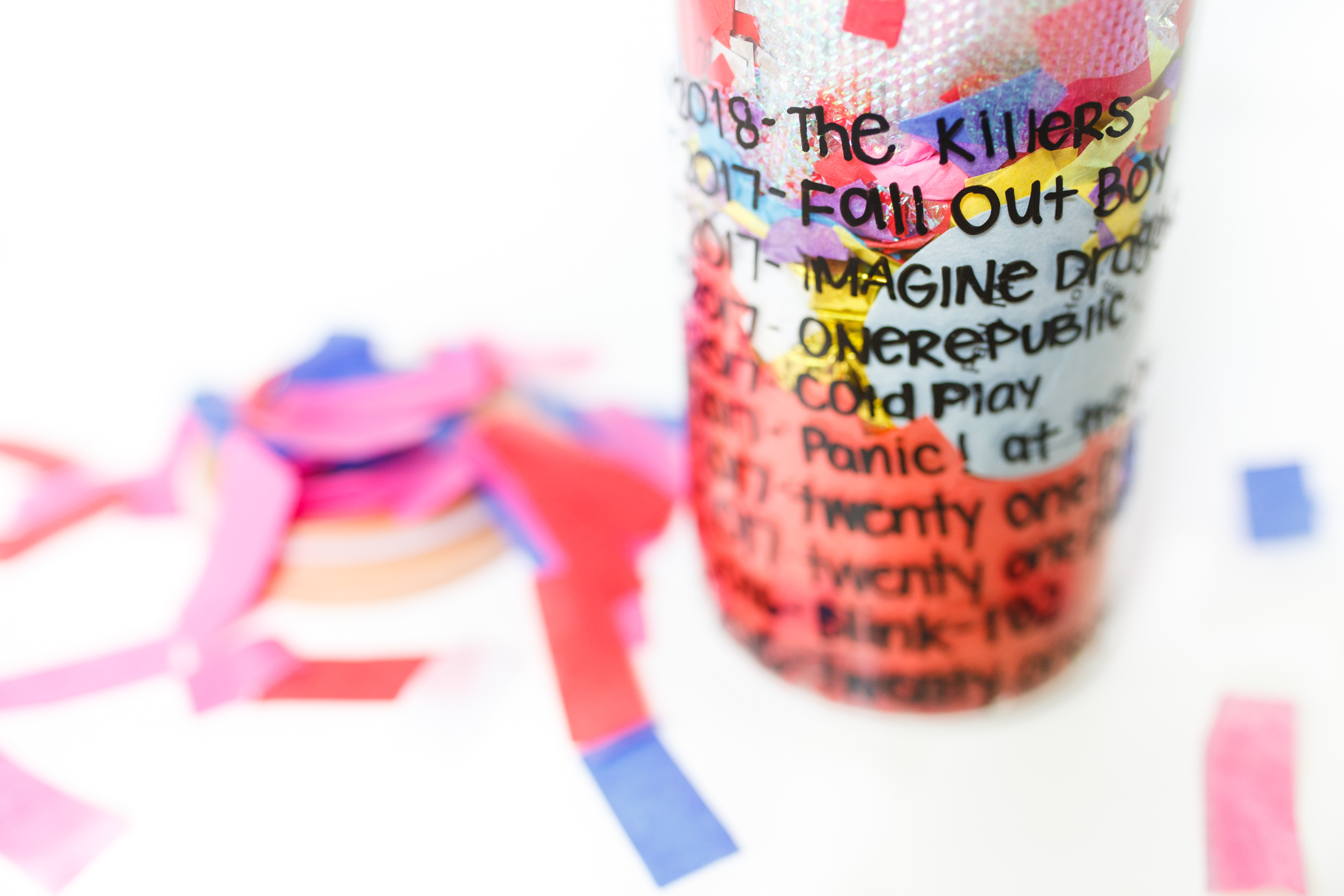 Marissa keeps her confetti in one tall cylinder and marks the layers with the date and name of the band.