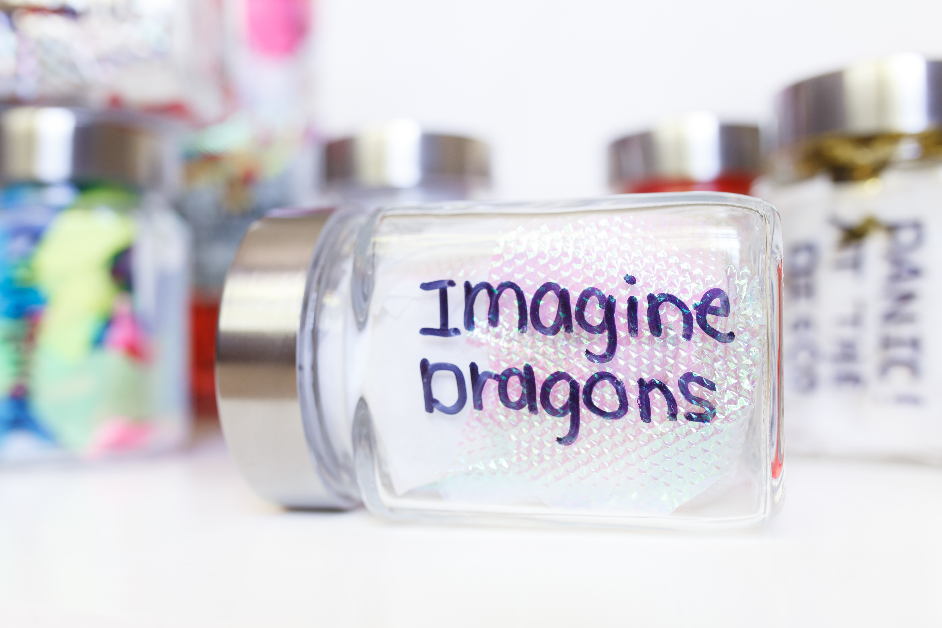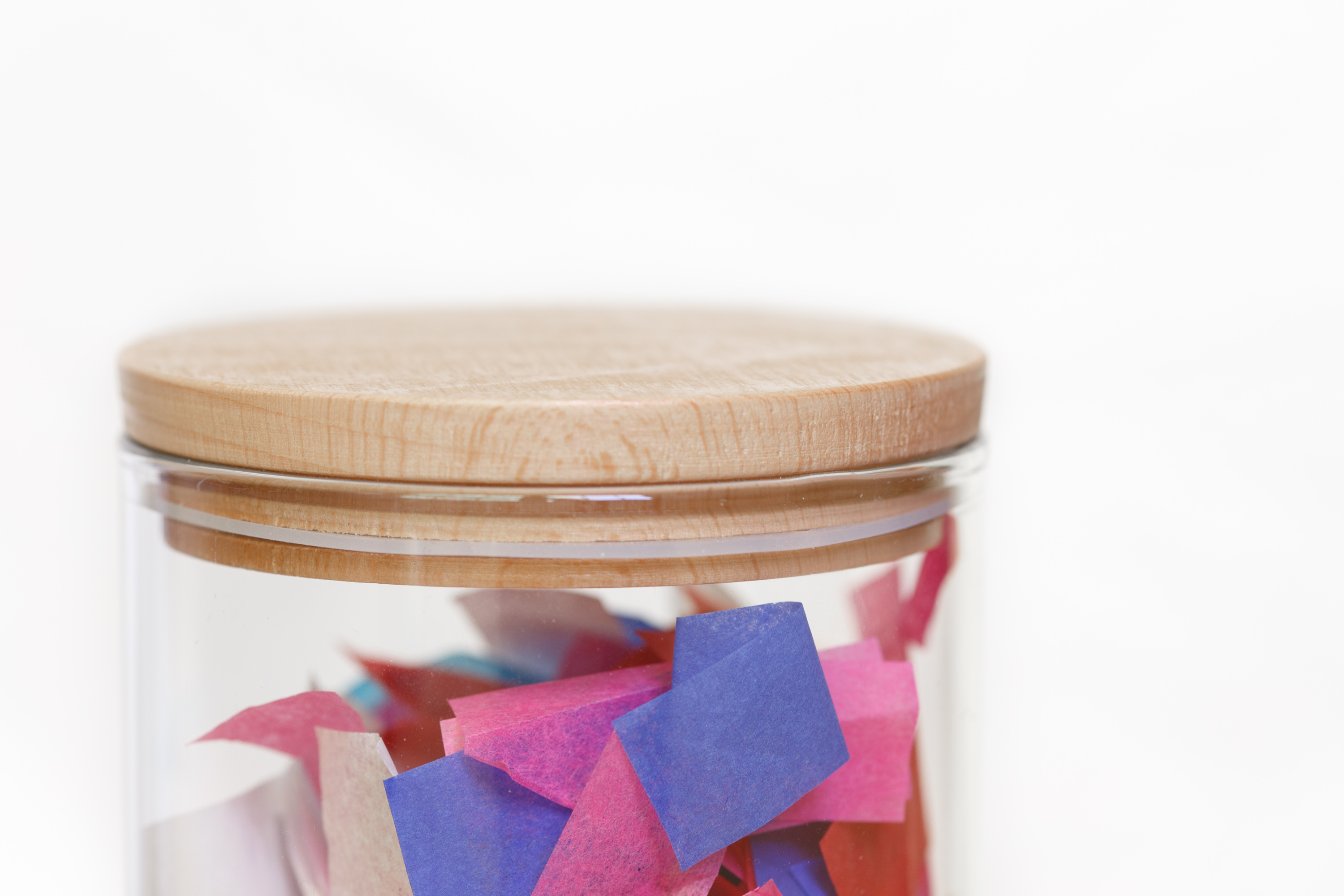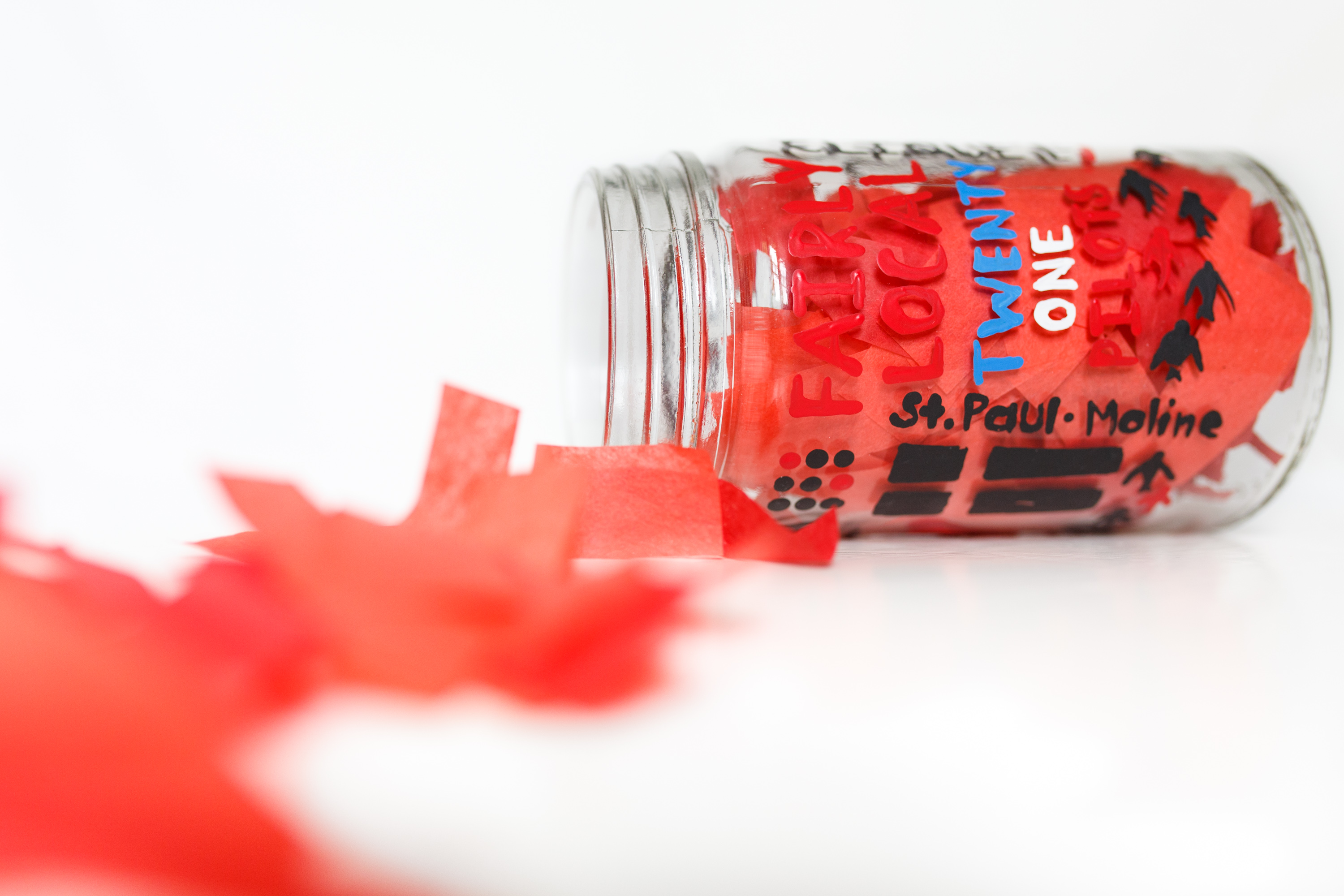 Marissa keeps her confetti in one tall cylinder and marks the layers with the date and name of the band.